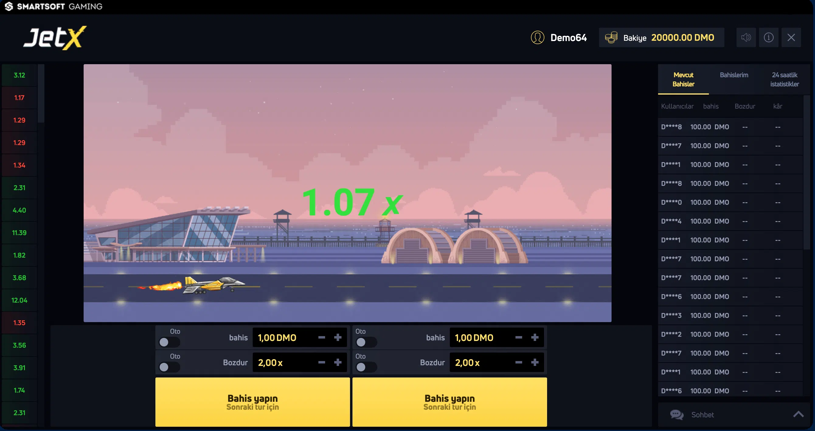 İlk olarak, elinizi demo sürümünde deneyin. Risk almadan oynamak, Aviator'ın mantığını anlamanıza ve